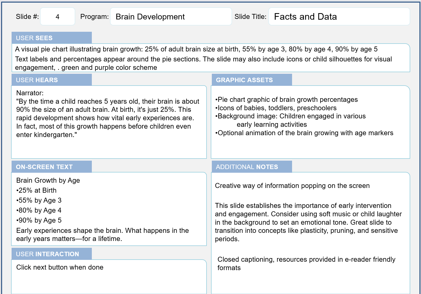 The participants in this training are early childhood educators working in licensed child care programs, serving children from 6 weeks to 5 years old. While none hold bachelor's degrees, some have earned associate degrees, and many have gained knowledge through hands-on experience rather than formal education. Their years of experience range widely, from just starting out to over 20 years in the field. These educators are deeply committed to the well-being of the children in their care and are motivated by practical, immediately applicable learning. They thrive when presented with visual, real-life examples that connect directly to their daily routines. Given their busy classroom environments and diverse educational backgrounds, training should be accessible, clearly presented, and focused on strategies they can use right away to support healthy brain development.